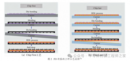 FO 封装 的 工艺 流 程 可 分为Chip First 工艺 和Chip Last(也叫 RDL First)工艺,其工艺流程如图 2 所示。Chip First 工艺是指先贴芯片后加工 RDL,先将单一芯片放置在用临时键合材料或热释放胶带(TRT)处理过的衬底上,再用环氧树脂(EMC)包覆成型并固化,然后去掉衬底后再加工 RDL。但在 EMC 工艺流程中,衬底翘曲和键合材料软化会导致芯片偏移和 RDL的错位。Chip Last 工艺是指先加工 RDL 然后再贴装芯片,在该流程中,RDL 结构既可以进行电子测试,也可以进行目测检查,以确定芯片良率,该工艺适合于良率至关重要的大型 I/O 芯片。