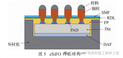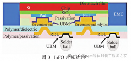 InFO 是台积电于 2016 年推出的一种 FO 封装技术,其封装结构如图 3 所示[11]。InFO 技术将芯片直接放置在基板上,使用 RDL 来互连芯片和基板,无需使用引线键合,该 RDL 在晶圆表面形成,给键合垫片重新分配更大的间距,从而允许更多的 I/O 连接,实现了更紧凑和高效的设计。