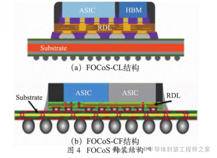 FOCoS 为日月光 2021 年推出的一种 FO 封装技术 ,主 要分 为 Chip First (FOCoS-CF) 和 Chip Last(FOCoS-CL)2 种技术流程的解决方案,封装结构如图4 所示。FOCoS-CF 解决方案利用封胶体分隔 RDL 以改善芯片封装交互作用(CPI),在 RDL 制造阶段降低芯片应力上的风险以及提供更好的高频信号完整性。FOCoS-CL 方案则是先分开制造 RDL,再整合多个Chiplet,该方案有助于解决传统晶圆级工艺流程中因为 RDL 不良率高所造成的芯片额外损失的问题。