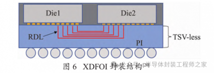 多维扇出封装集成(XDFOI)是长电科技于 2021年面向 Chiplet 异构集成应用推出的以 2.5D TSV-less(无 TSV)为技术特点的新一代封装技术,其封装结构如图 6 所示,2022 年长电科技XDFOI Chiplet 高密度多维异构集成系列工艺进入稳定量产阶段,其主要用于对集成度和算力有较高要求的FPGA、GPU 和 5G芯片等领域。