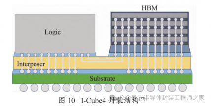 三星也有类似于台积电 CoWoS-S 的 I-Cube 技术,三星使用这种封装的主要客户是百度的 AI 加速器。2018 年,三星推出了被称为“I-Cube2”的技术,这项技术是一种异构集成技术,在一个硅中介层上水平放置一个或多个逻辑裸片(CPU、GPU 等)和多个高带宽存储器(HBM)裸片。2021 年,三星展现了“I-Cube4”新一代封装技术,也就是“Interposer-Cube4”,其中集成了4 个 HBM 和一个逻辑裸片,从高性能计算到人工智能、5G、云数据应用,I-Cube4 可通过异构集成实现更高的通信速度和能效,其封装结构如图 10 所示。