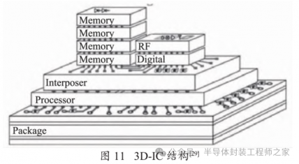 随着半导体工艺技术不断缩放,设计复杂度不断增加,传统的二维集成芯片设计赶不上摩尔定律的缩放趋势。此外,在高端性能封装中,处理芯片和存储芯片对高带宽、低延迟有严格要求[28],于是业界从三维的概念寻找解决方案。3D 集成(3D-IC)是指通过 TSV 实现不同芯片层之间电学互连的 3D IC 堆叠技术,其结构如图 11 所示。3D 集成包括 3D IC 封装、3D IC 集成和 3D Si 集成,后两者使用 TSV,而 3D IC 封装不使用TSV。3D-IC封装可容纳多个异构裸片且各功能模块可采用不同的制程节点,这可大大降低成本并提高产品上市速度。此外 3D-IC 支持更小的尺寸,可以节省电路板和终端产品的空间,是小型移动设备的理想选择。