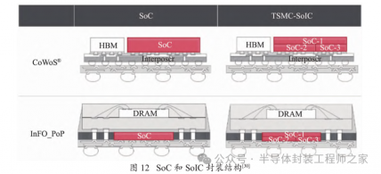 SoIC 应用了 TSV、微凸点和混合键合等先进技术,从而可实现超过 10 000/mm2 I/O 密度的封装。SoIC的独特之处在于其无凸点键合结构,与常规的凸点键合相比,SoIC 能实现更高的集成密度和更优越的运行表现。通过 SoIC 技术,无论是同质还是异构的 Chiplet都能被集成到一个更小、更薄的类似 SoC 的微芯片上,进而实现与先进的 WLSI (晶圆级系统集成,如CoWoS 和 InFO)的完美结合。台积电的 SoIC 可与CoWoS 和集成扇出型叠层封装(InFO-PoP)相结合并共同使用。SoC 和 SoIC 封装结构如图 12所示。新集成的芯片在外形上与常见的 SoC 芯片相似,然而其内部嵌入了必要的异构集成功能。SoIC 技术不但保留并融合了原有的 InFO 和 CoWoS 技术,而且大大提升了系统的单芯片性能。