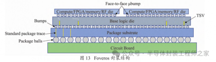 2018 年 12 月,英特尔首次展示了 Foveros 封装技术,该技术也叫三维面对面异构集成芯片堆叠,它是一种堆叠式芯片封装技术,可以将多个不同制程的芯片层通过微型互联线连接在一起,实现了高速、低功耗的芯片互连,其封装结构如图 13 所示。