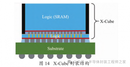 X-Cube 是第一代 3D IC 晶圆级逻辑堆叠与集成技术,“X”表示 3D 中扩展的互连 密 度 和 扩展 的 功能[32]。X-Cube 封装结构如图14 所示,不同于 2D 平行封装,X-Cube 3D 封装允许多枚芯片在堆叠封装的方式下协同工作,通过 TSV 技术将 SRAM 存储芯片堆叠到主芯片上方,这种设计可以释放更多空间,使其他组件得以更紧凑地堆叠在一起。此外,其通过 TSV技术实现芯片之间的连接,不仅降低了功耗,而且大幅提高了数据传输速率。