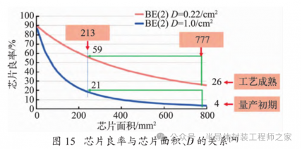 与传统的单芯片方案相比,Chiplet 方案的设计良率更高、成本更低。研究结果表明,当芯片面积小于10 mm2 时,单芯片和 Chiplet 方案的良率差别很小,但当芯片面积超过 200 mm2,单芯片方案的良率将明显低于 Chiplet 方案,降低幅度可达 20%以上。芯片良率与芯片面积、晶圆缺陷率 D 的关系如图 15 所示,可以预期,在 700~800 mm2 的面积上,单芯片方案的良率可能不超过 10%[33]。Chiplet 的另一个优势是允许将不同工艺下的芯片封装连接起来,这种弹性的设计方式提升了芯片封装的灵活性,提高了先进工艺的利用效率,同时降低了成本。