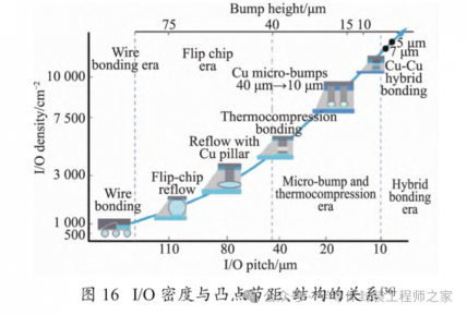 焊点是封装中最重要的互连结构之一,起着电气连接、温度传导以及机械支撑等重要作用。I/O密度与凸点节距、结构的关系如图 16 所示,随着凸点节距不断缩放,I/O 密度的持续提高会给焊点结构带来愈发严峻的挑战。