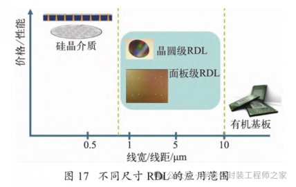 RDL 是指在晶圆表面沉积金属层和介质层,并形成金属布线,对 I/O 端口进行重新布局,将其布局到新的区域,并形成面阵列排布。采用 RDL 能够支持更多的 I/O 数量,使 I/O 间距更灵活、凸点面积更大。此外RDL 可以将不同种类的芯片连接在一起,在 3D 集成中,TSV 用于完成同种堆叠芯片的电气互联,而不同类型堆叠芯片的连接则需要 RDL 来实现。不同尺寸RDL 的应用范围如图 17 所示,不同线宽 / 间距(L/S)的 RDL 具有不同的应用范围,目前主流 RDL 的 L/S仍在 5 μm 以上。