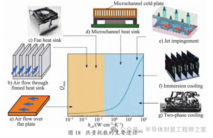 7 种常见的封装体热量耗散途径如图18 所示[39-41]。Qmax 为可耗散的最大功率,heff 为有效传热系数。虽然存在很多散热途径,但随着芯片性能和功耗的不断提升,产生的热量越来越高,这对封装的散热性能提出了更高的要求。随着封装集成度的不断提高,业界要求封装体能够为处理芯片提供热流密度高达 1000 W/cm2的热量耗散能力[42]。在先进封装中,3D 封装因其芯片堆叠方式,其散热问题一直很受关注。3D 封装散热问题主要存在于以下 4 个方面:(1)3D 封装需要将多个芯片堆叠在封装体内,芯片堆叠后发热量增加,但散热面积并未增加,这导致发热密度增加;(2)多芯片堆叠,热源相互接触,热耦合现象增强;(3)内埋置基板中的无源器件发热,由于有机或陶瓷基板散热能力较差,会产生严重的热问题;(4)封装尺寸不断缩小,组装密度不断增加,使得封装的散热设计不易进行。