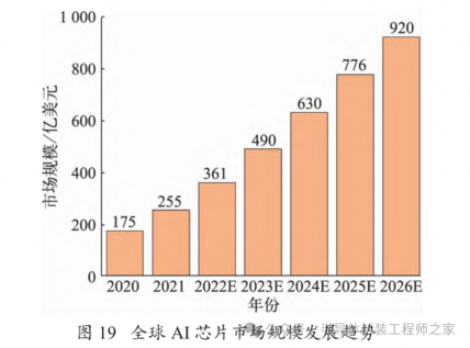 随着人工智能的火爆,面向 AI 应用的高性能芯片的需求持续增加,Frost&Sullivan 的统计数据显示,预计在 2020—2026 年,全球 AI 芯片市场规模将以29.3%的复合增长速度持续扩大,2023 年的市场总额将达到 490 亿美元,全球 AI 芯片市场规模发展趋势如图 19 所示。
