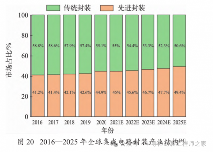 伴随着 AI 芯片的智能化和多功能化,具有异构集成、精密互连等技术特点的先进封装技术也不断得到研发,以便满足 AI 芯片高算力、低功耗以及小型化等的需求。全球封测技术目前正经历从传统封装向先进封装的转型,先进封装将成为未来封测市场的主要增长点,根据市场研究机构 Yole 的预测,全球先进封装市场 2019—2025 年的复合年增长率为 6.6%,2024年先进封装市场规模将接近 440 亿美元。与此同时,Yole 预测 2019—2025 年全球传统封装复合年增长率仅为 1.9%,增速远低于先进封装。2016—2025 年全球集成电路封装产业结构如图 20 所示。在未来的先进封装市场,具有 TSV、RDL、Interposer、Chiplet 等技术特点的先进封装将拥有广阔的市场前景。