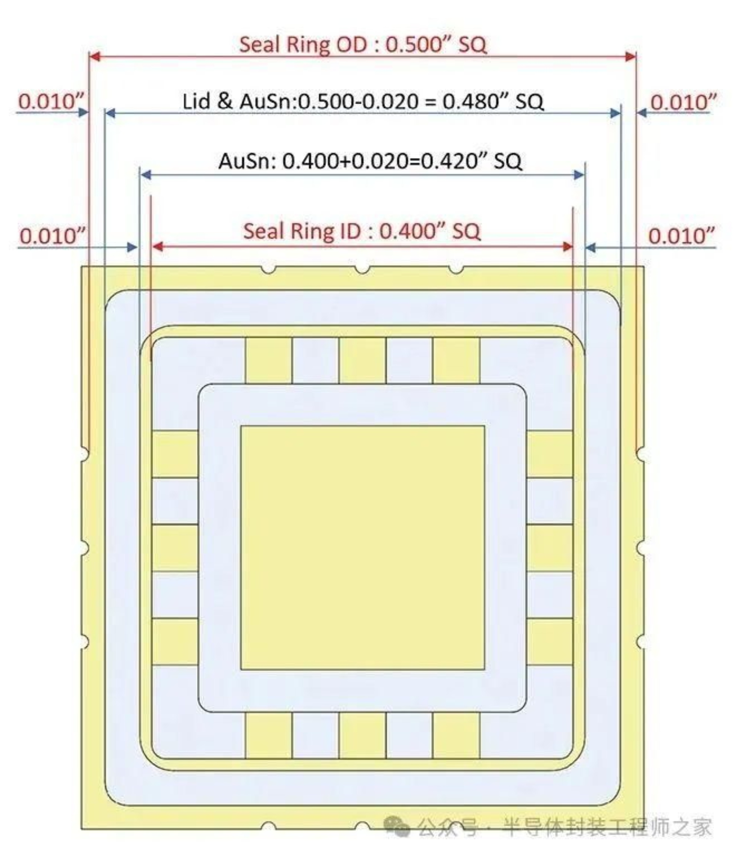 盖板尺寸: 若封装体密封环的外部长宽为 0.500 英寸见方,则盖板尺寸应为 0.500 英寸 - 0.010 英寸 - 0.010 英寸 = 0.480 英寸见方。
