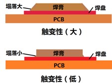 图2 印刷过程中焊膏粘度的变化 4.2 密度、合金与钎剂配比 前面已经提到,焊膏中合金钎料粉和钎剂的组成以及两者的配比对焊膏的特性有很大影响。通常在介绍焊膏时必须说明合金钎料粉的成份、配比以及钎料粉与钎剂的配比或者钎剂的含量。而焊膏的密度直观地反映了焊膏中合金粉的组成以及钎剂的含量,也可作为影响焊膏性能的重要参数。 (1) 熔点与相应的再流焊温度 焊膏的熔点主要取决于合金钎料粉的成份与配比。随着焊膏组成和熔点的不同,需采用不同的再流焊温度,而焊接效果和性能也各不相同。 (2) 合金钎料粉的形状和粒度 大多数焊膏都采用球形钎料粉,而粒度最适用的范围为200-325目,超出此范围的钎料粉以不多于10%为宜。对细间距器件的组装,需采用更细的钎料粉,其粒度为270-500目或325-500目。 4.3 触变指数和塌落度 焊膏作为触变性流体,触变指数是其重要参数。 焊膏的塌落度主要与焊膏的粘度和触变性有关,即焊膏的粘度和触变性在很大程度上控制着印刷后图形的保持特性,而且也影响着再流焊后焊膏的塌落情况,图3反映了焊膏触变指数与塌落度的关系。当触变指数高,塌落度就小,而触变指数低则塌落度。