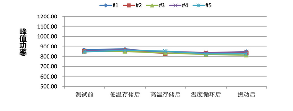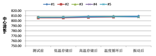 与铟焊料相比,无铟化金锡封装工艺具有抗热疲劳、耐高温、储存时间长、性能稳定、环境适应性强等优点,极大地提高了器件的可靠性。为彻底克服铟焊料封装存在的隐患,炬光科技已开发了全无铟化封装技术,生产了多系列的、全无铟化封装的、高可靠性的高功率半导体激光器产品。这些全无铟化技术封装的产品均通过了包括高、低温-40℃~+85℃存储和温循环境、以及相应的振动冲击等环境试验。从图16可以看出,环境试验后全无铟化封装激光器的功率衰减小于5%,光谱基本保持不变。