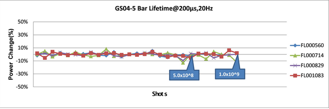 采用全无铟化封装技术可克服铟焊料封装器件易产生热疲劳、电迁移和电热迁移等问题,提升高功率半导体激光器的可靠性。炬光科技公司拥有全无铟化半导体激光器封装工艺技术,并成功实现了质量稳定的批量化生产,向客户提供高性能长寿命的半导体激光器产品。图12显示在QCW条件下额定功率为1500W的GS04激光器的寿命测试时间已经超过109shots,功率无任何衰减,目前寿命测试还在继续进行。