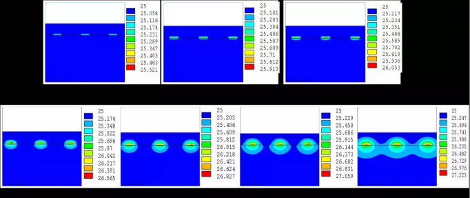 对于用于泵浦固体激光器的传导冷却高功率半导体激光器叠阵,通常工作在100μs-300μs的脉冲宽度范围内,瞬态热管理就至关重要。图 2是一个巴条内3个发光点的典型瞬态温度分布。通过分析瞬态条件下的热分布,深入研究每个巴条甚至每个发光点的温度特性,可以计算出半导体激光器叠阵的结温,分析其相对条件下的最高温度,指导实际的封装,提高器件的寿命和可靠性[7]。