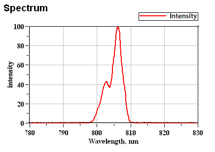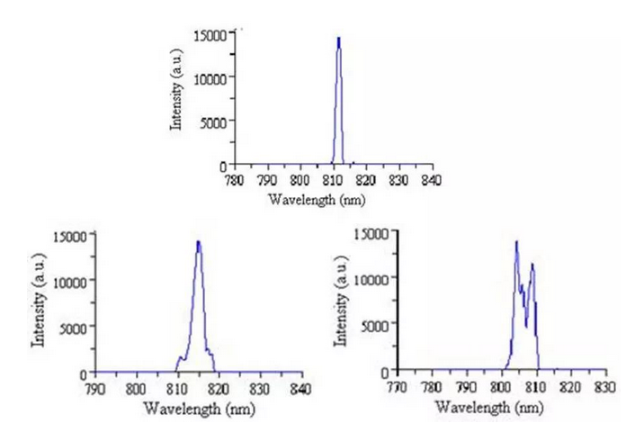 半导体激光器阵列的光谱展宽主要是由于每个发光点的发射波长不一致引起的。 对于高功率半导体激光器叠阵,宽光谱曲线可能会出现侧峰、双峰甚至多峰,如图13所示。叠阵内每个巴条输出波长不一致以及由于封装导致的热和热应力效应都将使巴条输出光谱展宽,其中后者是主要因素[13]。