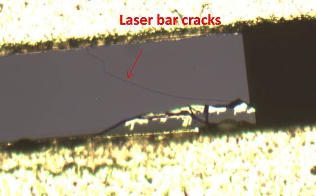 较大的热应力会导致半导体激光器巴条损伤,甚至芯片断裂,如图 8 所示。