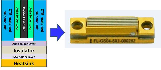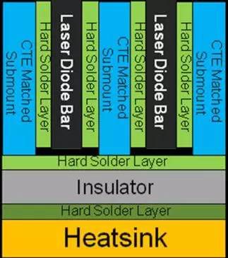减小热应力的影响有三个途径:第一,采用热传导率高,并且热膨胀系数与芯片更加匹配的衬底/热沉材料;第二,通过优化封装工艺降低施加在激光器巴条上的热应力;第三,通过优化封装工艺降低巴条组上热应力分布的不均匀性。