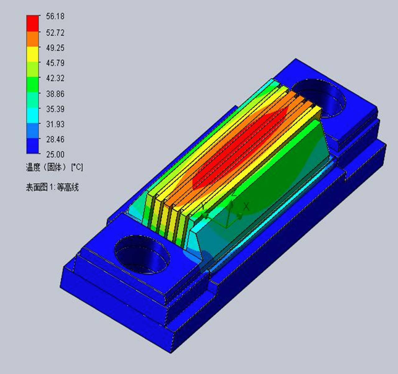 图3是GS04-5bar结构达到稳态后的温度分布,可以看出,该结构的最高点温度为56.18℃,位于巴条组中心位置,从中心到巴条组边沿温度逐渐降低。若每个巴条所产生的废热能被及时带走,达到稳态后每个巴条的温度会均匀分布,不会产生中间部位温度偏高的现象。这与该结构所工作的脉宽和重复频率有关,存在相邻巴条之间的热串扰现象[8]。为降低热串扰,需要优化器件结构,或降低器件工作的脉宽和重复频率。