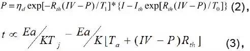 半导体激光器的输出功率与热阻的关系如(2)式所示,器件使用寿命与热阻的关(3)式所示。