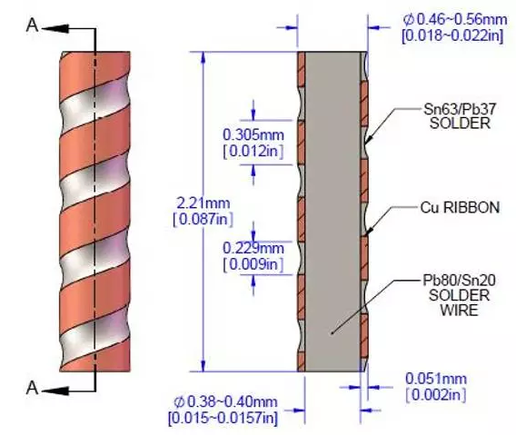 图3为一种常用规格螺旋锡柱及其截面示意图。中心为80Pb/20Sn锡丝,表面绕厚度为0.051mm的铜箔,然后整体覆一层63Sn/37Pb共晶焊料将锡柱包裹。