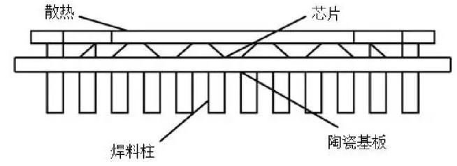 CCGA器件的封装结构(如图4)大体由三部分组成:底部是高铅含量的焊柱阵列,中部为陶瓷基板,集成电路芯片则置于基板顶部,且多采用倒装形式,这种形式缩短了信号通路,降低了寄生效应,使信号速度和品质得到提高。