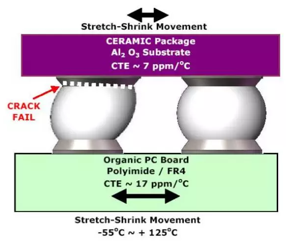 图6、7、8分别为锡球、普通锡柱、螺旋锡柱大温度波动测试结果(产生陶瓷柱栅阵列和PCB板间的剪切应力)(热膨胀系数失配度~10ppm/oC)。可以看出,锡球对陶瓷基板和PCB之间因CTE不匹配而产生的应力适应力较差,焊点出现了坍塌。CCGA因连接高度增加后,焊点上的应力将通过焊柱的弯曲来进行释放,从而能更好地适应陶瓷基板和PCB之间因CTE不匹配而产生的应力。而螺旋锡柱较普通锡柱倾斜度更小,对此剪切应力的吸收能力更强,具有更好的支撑能力。