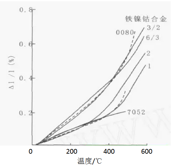 玻璃-金属匹配封接常用的封接材料主要有: 铁合金(镍钢) , 通过改变镍的含量从35%到65% , 膨胀系数连续地变化, 这样便能获得恰好与真空玻璃相匹配的合金。这些合金的膨胀系数在磁转变点(居里点) 增大, 这更有利于匹配退火温度下的玻璃为。典型合金的膨胀特性曲线如图2 所示。镍钢内镍含量少, 膨胀系数变小, 居里点也降低。若要居里点高于400℃, 镍含量就必须大于44%, 这样膨胀系数便大于70×10-7℃21, 这只能和软玻璃封接。例如,50%N i250%Fe 合金, 膨胀系数约90×10-7℃21 , 居里点约500℃, 能和DB-401 玻璃或0120 玻璃匹配封接。为了改善接头的真空密封性, 常常添加少量铬(0.8%~6%)。封接时生成的氧化铬溶入玻璃内并牢固地粘附于合金表面。