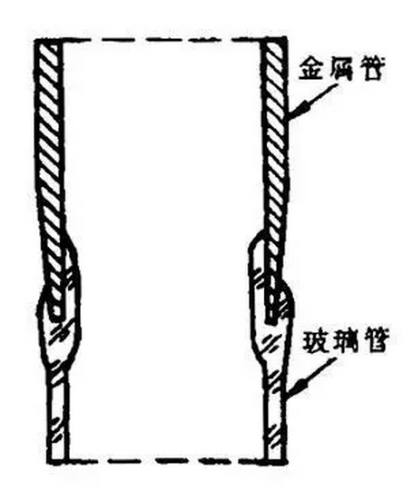 上图是金属管与玻璃管的一种非匹配封接形式。 金属管管壁在封接处逐渐变薄,以利于变形,变薄的区域约等于封接区长度的一倍。这种封接一般分为外封接(玻璃仅熔接在金属管壁外侧),内封接(玻璃仅熔接在金属管壁内侧)和双边封接(玻璃从内、外二侧包住金属管壁)三种。双边封接时内侧的玻璃封接长度最好是外侧的二倍。这类封接不大经受得住温度的反复升降,例如铜与玻璃封接时,如果温度的摆幅是室温到400℃,则仅能使用几百次