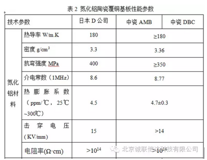 表2为两类氮化铝陶瓷覆铜基板性能比对,可以看出,AMB工艺相比于DBC工艺具有更高的可靠性和更好的综合性能。