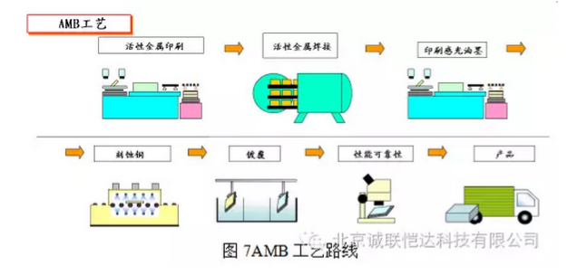 活性焊铜工艺是DBC工艺技术的进一步发展,它是利用钎料中含有的少量活性元素与陶瓷反应生成能被液态钎料润湿的反应层,从而实现陶瓷与金属接合的一种方法。该工艺路线如图7所示:先将陶瓷表面印刷活性金属焊料而后与无氧铜装夹后在真空钎焊炉中高温焊接,覆接完毕基板采用类似于PCB板的湿法刻蚀工艺在表面制作电路,最后表面镀覆制备出性能可靠的产品。AMB基板是靠陶瓷与活性金属焊膏在高温下进行化学反应来实现结合,因此其结合强度更高,可靠性更好。但是由于该方法成本较高、合适的焊料较少、焊料对于焊接的可靠性影响较大,只有日本几家公司掌握了高可靠活性金属焊接技术.