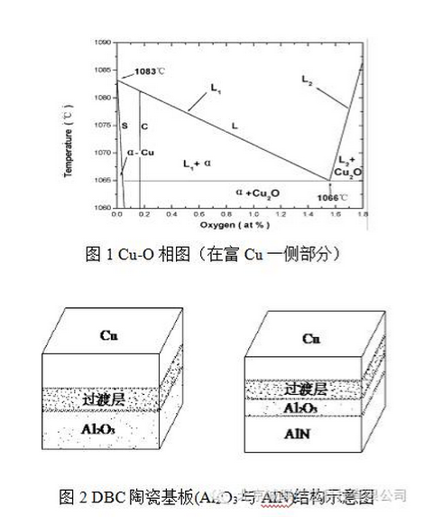 所谓的DBC技术,是指在在含氧的氮气中以1063℃左右的高温加热,氧化铝或氮化铝陶瓷表面直接焊接上一层铜箔。其基本原理是:利用了铜与氧在烧结时形成的铜氧共晶液相(图1),润湿相互接触的两个材料表面,即铜箔表面和陶瓷表面,同时还与氧化铝反应生成CuAlO2、Cu(AlO2)2等复合氧化物,充当共晶钎焊用的焊料,实现铜箔与陶瓷的牢固结合[]。但由于氮化铝是一种非氧化物陶瓷,敷接铜箔的关键是使其表面形成氧化物过渡层,然后通过上述过渡层与Cu箔敷合实现AlN与Cu箔的敷合[]。其结构大致相同,如图2所示。