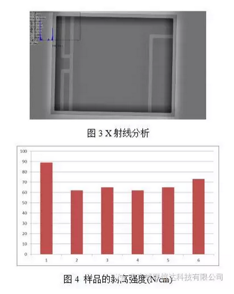 基于上述基础理论,我们系统研究了氮化铝陶瓷表面氧化、无氧铜氧化以及直接覆铜等工艺,优化了工艺参数,制备出氮化铝陶瓷覆铜板。采用X射线对样品进行分析如图3所示。可以看出,样品内部没有发现明显空洞存在,特别是芯区无空洞,上下界面空洞含量均小于3%。将样品切成10mm宽的长条预制切口,测试铜从陶瓷表面拉起的拉力,结果如图4所示,样品的剥离强度均大于60N/cm。