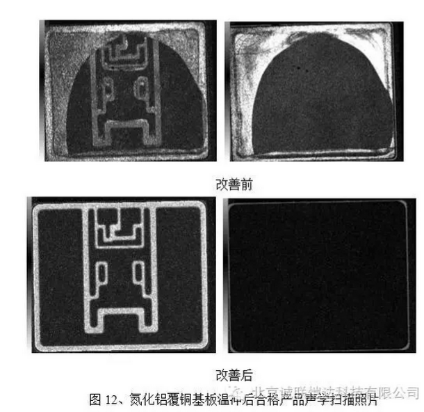 氮化铝覆铜基板批温度冲击的可靠性是其性能的关键因素,要求氮化铝覆铜基板在芯片焊接完成后,要能承受-40℃~+150℃,100次的温度循环。我们对氮化铝陶瓷覆铜基板开展了一系列优化,包括覆铜基板的设计优化和覆铜基板的工艺优化,最终完全达到了温度循环可靠性要求。改善前后氮化铝覆铜板经过温度循环后焊接情况如图12所示。