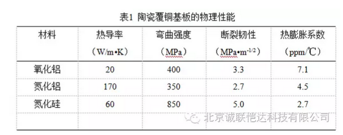 陶瓷基板材料的性能是陶瓷覆铜板性能的决定因素。目前,已应用作为陶瓷覆铜板基板材料共有三种陶瓷,分别是氧化铝陶瓷基板、氮化铝陶瓷基板和氮化硅陶瓷基板,表1列出了三种基板材料的性能。氧化铝基陶瓷基板是最常用的陶瓷基板,由于它具有好的绝缘性、好的化学稳定性、好的力学性能和低的价格,但由于氧化铝陶瓷基片相对低的热导率、与硅的热膨胀系数匹配不好。作为高功率模块封装材料,氧化铝材料的应用前景不容乐观。