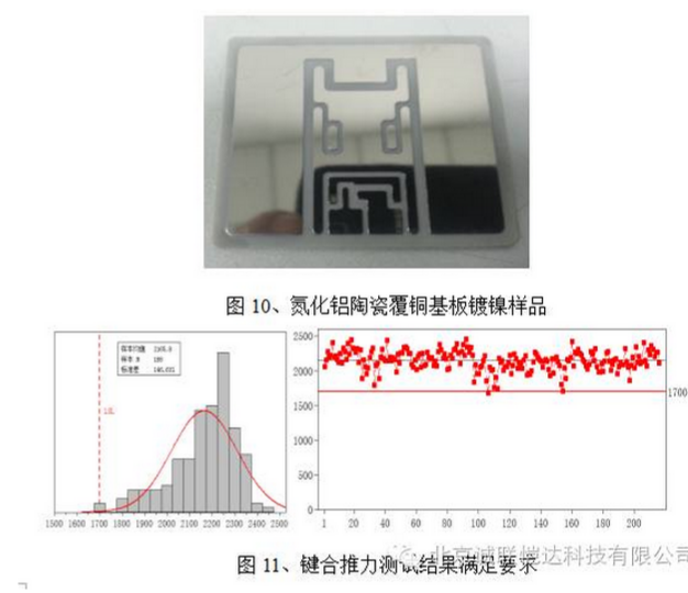 AMB基板在压焊时要求镀层有较好的焊接性,在250℃下有较好的结合力,因此其表面需要进行镀镍处理。而AMB基板刻蚀出图形后,表面有大量孤岛,进行电镀困难大而且镀层厚度不均匀,因此化学镀镍无疑是最好的选择。为了提高镀镍层的均匀性,采用化学镀Ni-P技术来实现氮化铝陶瓷覆铜基板的表面镀镍,通过对镀液和镀覆参数的优化,镍层厚度可控制在3-5μm,均匀性可控制在±0.2μm。同时,对氮化铝覆铜板的可键合性进行的工艺实验,如图11所示,键合推力均大于1700g,满足高压IGBT模块的应用可靠性要求。
