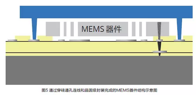 MEMS 工艺不同于CMOS 工艺的另一个方面在于前者对封装的特殊需求。对CMOS 来说,当器件通过互连方式完成多层部线,即可通过侧面打线、倒装焊接, 或基于硅通孔(TSV) 技术的多维(2.5D/3D)封装进行封装连线,再用塑封材料填充封装。而对MEMS 来说,器件的悬臂梁结构必须能够自由运动,因此, 不能像CMOS 那样进行填充封装,而必须采用帽封方式,把悬臂梁等部件用封帽罩起来。帽内不填注材料。特别是运动型MEMS 器件, 需要在封帽内保持真空。因此MEMS 封装带来了很大的工艺复杂度和成本上升。在采用单芯片帽封工艺时, 真空封装的MEMS 制造成本中,封装占70% 以上。一个降低成本的手段是采用晶圆级封装,即在一个硅片上,设计制造一个空腔,形成封盖晶圆,再把封盖晶圆盖到器件晶圆上,实现晶圆级真空封装。为了与晶圆级封装相匹配,还要考虑电学引线的连出。图5 给出了通过硅通孔连线和晶圆级封装完成的MEMS 器件结构示意图。