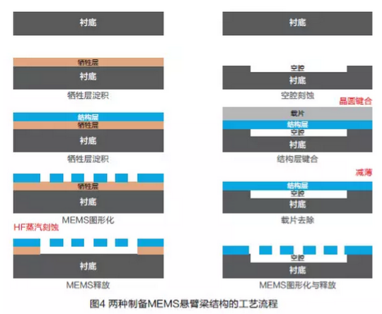 MEMS 制造技术衍生自CMOS 集成电路制造技术。在过去的50 多年时间里, CMOS 集成电路制造技术发展迅猛,成为有史以来精细度和复杂度最高的制造技术。单从器件尺寸上说,从1970 年代的1 微米线宽,已经微缩到现在的20 纳米线宽, 使得单位硅衬底面积上的器件数量有了极大地提高。在器件图形化方面, CMOS 技术的工艺能力远远超过MEMS 器件制造的需求。可以说,CMOS 集成电路制造技术为MEMS 制造奠定了十分坚实的基础。但另一方面,MEMS 制造工艺又有它不同于CMOS 制造的特点。首先,是它独特的悬臂梁部件形成工艺。目前可供选用的悬臂梁形成工艺有两类,一类采用牺牲层工艺,另一类采用晶圆键合工艺。图4(左) 给出了采用牺牲层工艺形成悬臂梁的流程示意图。具体做法是在硅衬底表面淀积牺牲层,比如二氧化硅层、结构层、多晶硅层。之后采用特殊的工艺设计,通过光刻、刻蚀、化学机械抛光(CMP) 等CMOS 图形化工艺将牺牲层暴露出来,并用化学溶剂(湿法)或化学蒸汽(干法)把吸收层腐蚀掉,使结构层悬空,形成悬臂梁。图4(右) 展示的是采用晶圆键合工艺形成悬臂梁的流程示意图。具体做法是在硅衬底上先形成悬臂梁下的空腔,再将结构层晶圆表面向下,与衬底晶圆键合在一起。之后采用减薄技术,将结构晶圆从背面减薄, 只保留满足悬臂梁要求的厚度。再通过光刻、刻蚀等CMOS 图形化工艺, 形成悬臂梁。两种技术方案的区别在于前者的工艺相对简单,除了在采用蒸汽刻蚀时需要引入特殊的蒸汽刻蚀设备,基本可使用现有的CMOS 工业设备,与CMOS 制造的兼容性好。而采用晶圆键合工艺需要使用晶圆键合设备,因此技术复杂度相对较高, 并因此增加了一些制造成本。它的优点是悬臂梁的质量和工艺一致性高。在牺牲层工艺中,结构层是由高温淀积形成的多晶材料,层内不可避免地残存有应力。这样, 薄膜生长工艺条件的涨落很容易造成片内和片间均匀性问题,甚至造成良率的降低。采用键合工艺形成的结构层是单晶材料, 层内没有高温生长带来的应力,材料性能的一致性好,对良率提升有很大助益。