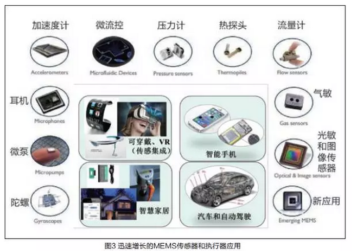 MEMS 技术有非常广阔的应用前景, 特别是进入物联网时代,只有MEMS 能够满足物联网应用对传感器和执行器的要求。首先,MEMS 的尺寸完全满足物联网应用的微型化要求。其次,MEMS 技术与CMOS 技术的兼容性,使之很容易满足物联网对传感器和执行器的智能化要求。采用相同的工艺线, 可以同时完成CMOS 集成电路和MEMS 器件的制造, 实现两者的异质集成。异质集成可以通过在同一个芯片上完成两者的制造和相互连接,也可以在不同的晶圆上制造,再通过2.5D 或3D 封装集成到同一个系统。第三个优势是MEMS 在能量损耗上的优势。物联网应用在功耗方面的要求比其它应用环境要严苛得多。MEMS 的感知和执行方式使它成为能耗较低的器件,最可能成为满足物联网功耗要求的技术。还有一个优势是它能够满足物联网应用对传感器/ 执行器的数量要求。硅基集成电路技术可以在一个晶圆上制造出数万颗MEMS 传感器,同时具有低廉的制造成本。得益于CMOS 制造技术发展过程中的研发投入, MEMS 制造所需要设备、工艺制造技术都已经存在。只需做较小的调整和开发, 就可以用于MEMS 生产。事实上,目前世界上用于MEMS 制造的生产线主要还是从CMOS 主流产品制造上淘汰下来的8 英寸线。采用这些产线,即可用满足海量制造的要求,又可以使每一颗MEMS 的制造成本降到满足消费类产品的价格要求的程度。