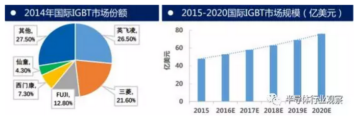2015年国际IGBT市场规模约为48亿美元,预计到2020年市场规模可以达到80亿美元,年复合增长率约10%。