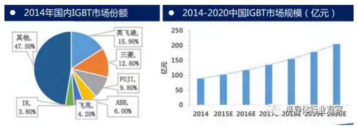 2014年国内IGBT销售额是88.7亿元,约占全球市场的1∕3。预计2020年中国IGBT市场规模将超200亿元,年复合增长率约为15%。