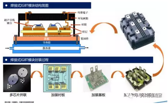IGBT模块按封装工艺来看主要可分为焊接式与压接式两类。高压IGBT模块一般以标准焊接式封装为主,中低压IGBT模块则出现了很多新技术,如烧结取代焊接,压力接触取代引线键合的压接式封装工艺。
