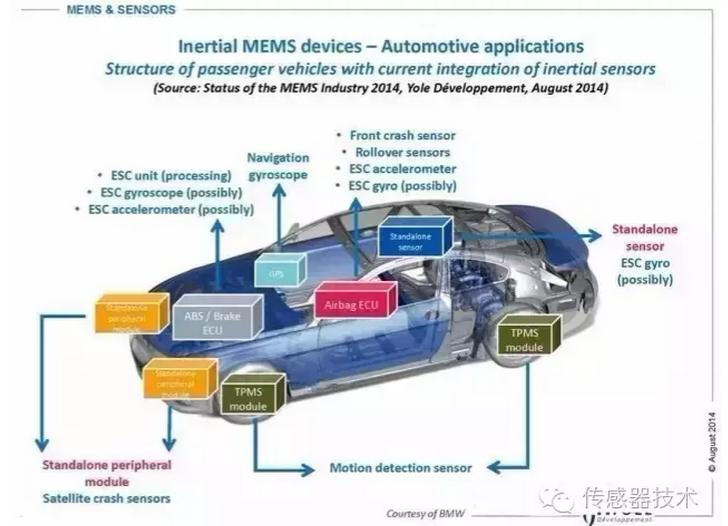 按销售额计算,最大的五种汽车MEMS应用按降序排名是:ESC,安全气囊,进气歧管绝对压力(MAP),TPMS与翻滚探测。
