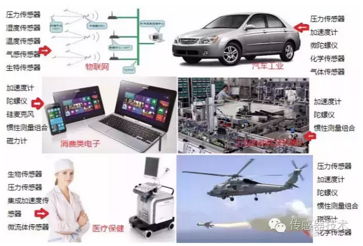 MEMS传感器作为获取信息的关键器件,对各种传感装置的微型化起着巨大的推动作用,已在太空卫星、运载火箭、航空航天设备、飞机、各种车辆、生特医学及消费电子产品等领域中得到了广泛的应用。