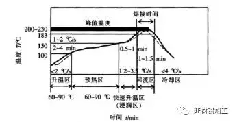 电子组装中采用的软钎焊技术中主要采用的是红外法以及对流法,但在应用的过程中对产品成品率以及焊点完整性工艺造成影响的因素包括:对基板及焊膏进行预热的温度和时间、峰值温度以及在峰值温度的过程中所停留的时间、冷却速率等。而常用锡铅焊膏再流焊温度曲线如图2所示: