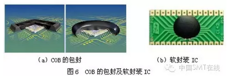 COB(chip On board,板上芯片)是一种典型的介于封装和组装之间的制造技术,裸芯片直接安装到印制电路板上,而不是先“封装”后组装到印制电路板上。COB制造工艺与传统裸芯片封装相似,只是封装基板换成了常规印制电路板,通过打线、载带或倒装芯片方式使裸芯片直接连接到电路中。为了保护裸芯片不受环境影响,防止芯片和连接线损坏,需要用胶把芯片和键合引线包封起来,如图5所示。COB工艺也称为“邦定”( boarding音译),用COB工艺提供的集成电路或电路模块也称为“软包封”或“软封装”电路,如图6所示。