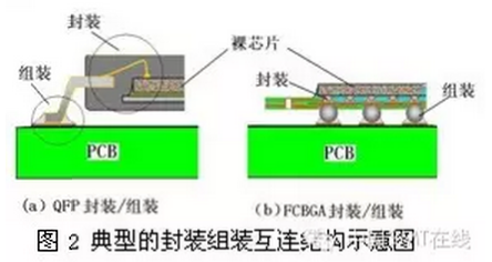 从技术本质来说,封装与组装都是为了实现电路的电气互联,只不过封装是实现“芯片级”互联,而组装则是“板卡级”互联,二者都是互联过程的“二传手”而已。有关电气互连将在后面章节专门讨论,这里我们从直观看它们的联系,如所示,是目前典型的QFP(图2a)与BGA(图2b)封装组装互连结构示意图。