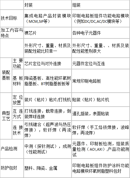 封装与组装技术的主要就是元素和技术环节有许多彼此相通的地方,有些环节实际是完全一致的,只不过不同领域侧重点有差异而已。封装与组装技术比较见表1。