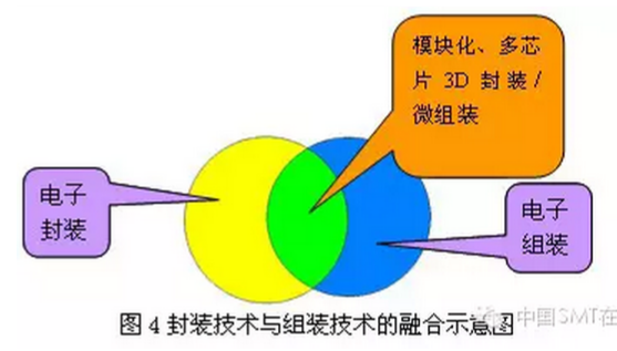 传统的观念认为封装技术属于半导体制造,其尺寸精确度和技术难度高于组装技术,属于高技术范畴,而组装技术则属于工艺范畴。但是在电子产品微小型化和多功能化市场需求的强力推动下,特别是近年兴起的多芯片、模块化的堆叠封装/组装(PiP /PoP,又称3D封装/组装)技术、实质上是封装技术和组装技术综合应用,从而使 “封装”和 “组装”的界限日益模糊,二者正在向着交汇的方向发展。这种技术的融合,在封装领域称为模块化多芯片3D封装,而在组装领域称为微组装(MPT—micro packaging technology),其实二者是殊途同归,如图4所示。